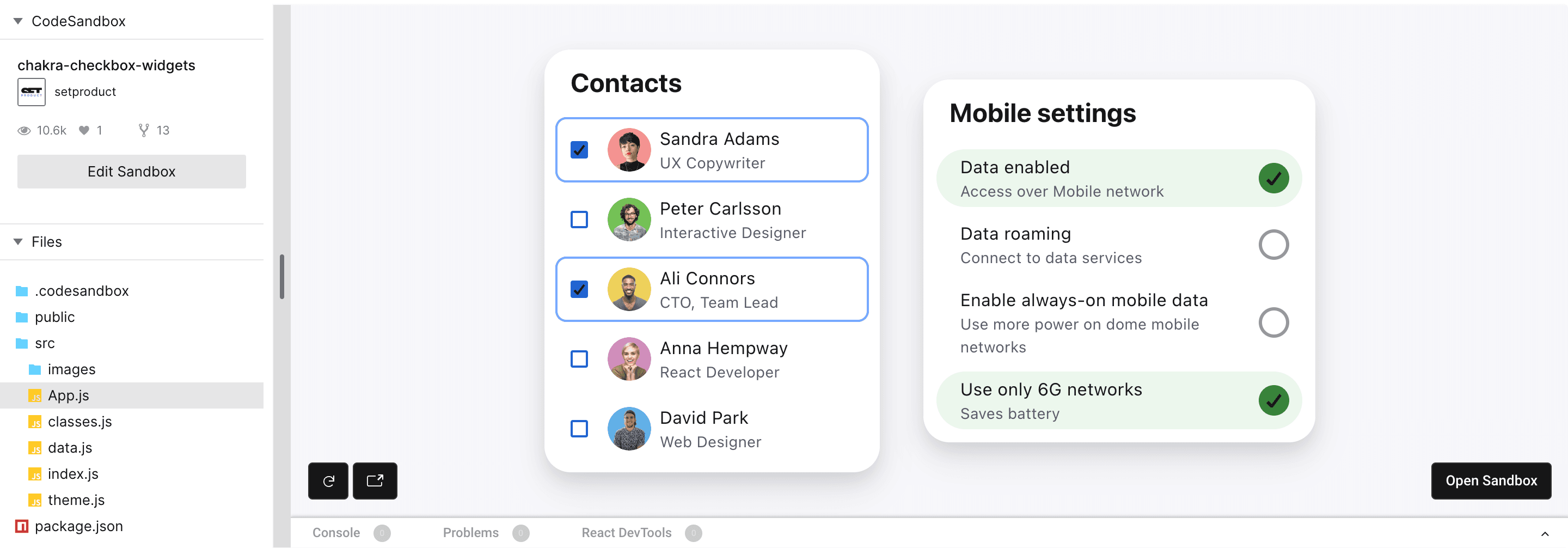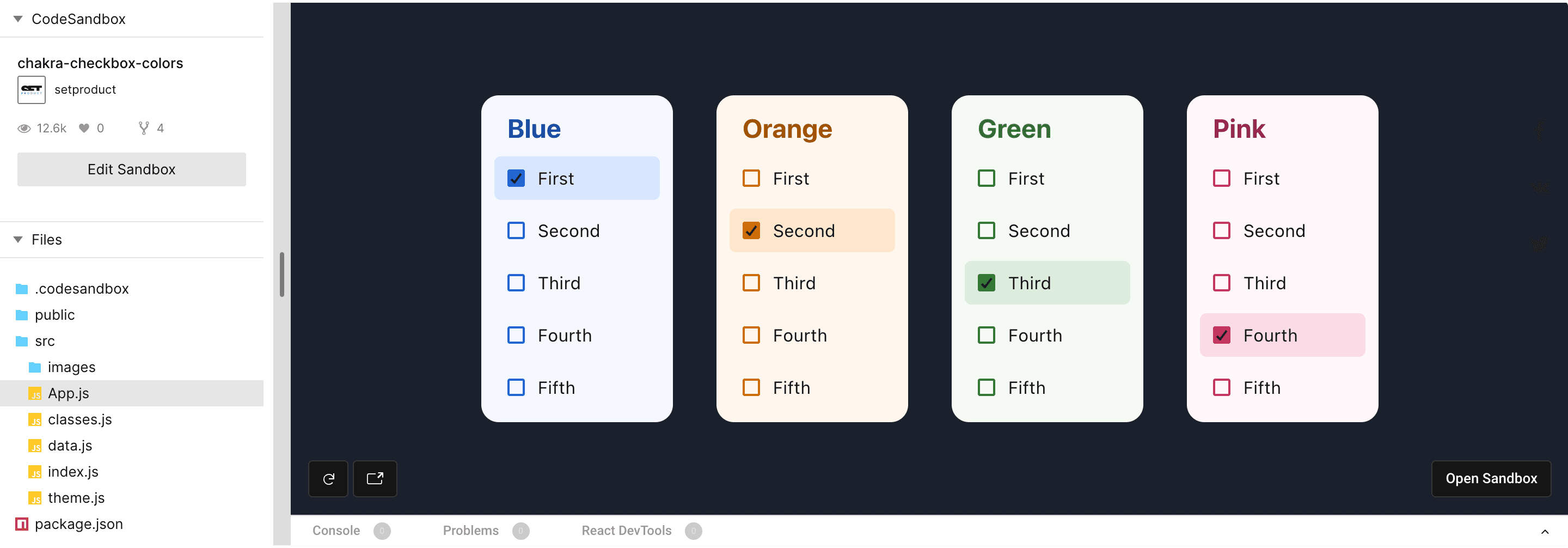 Swapping color themes for the checkbox component is easy within the color tokens. There are 10 tokens for each color in the Chakra palette. Each color is numbered: the higher the value – the darker is color. Overall, Chakra's colors are well-set and good to go with, taking off the headache to compound a palette for your next app UI.