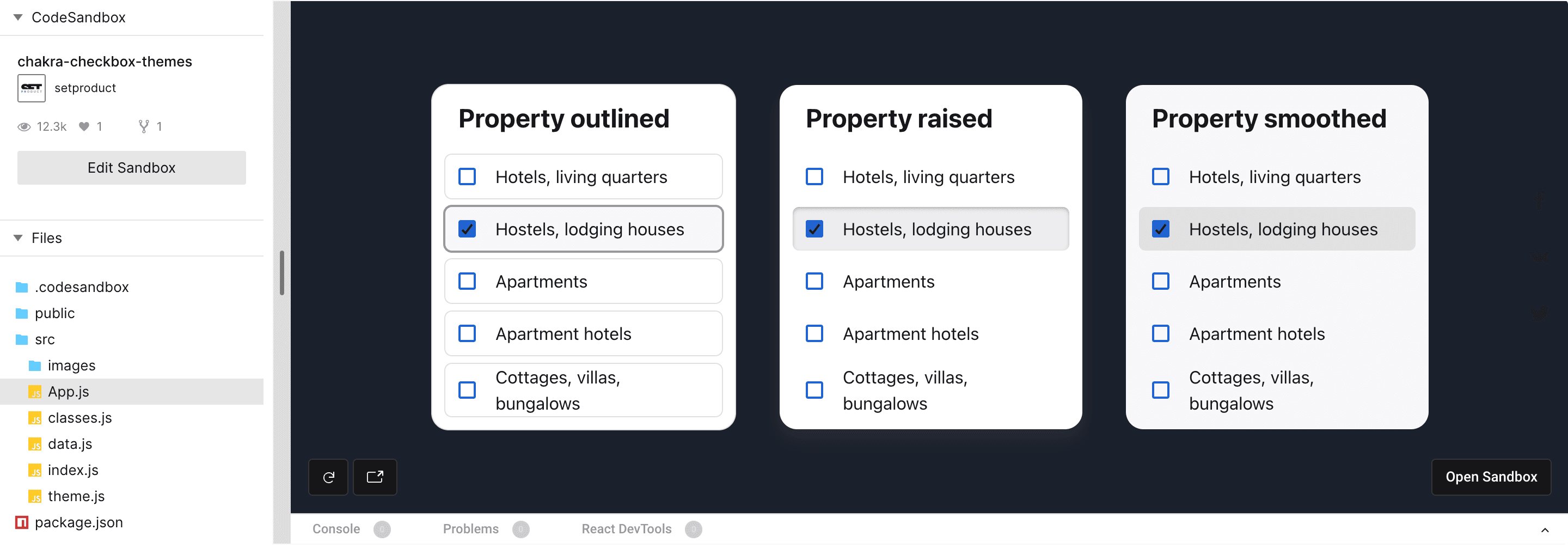 Play with styled checkboxes below (Outlined, Raised, Smooth):