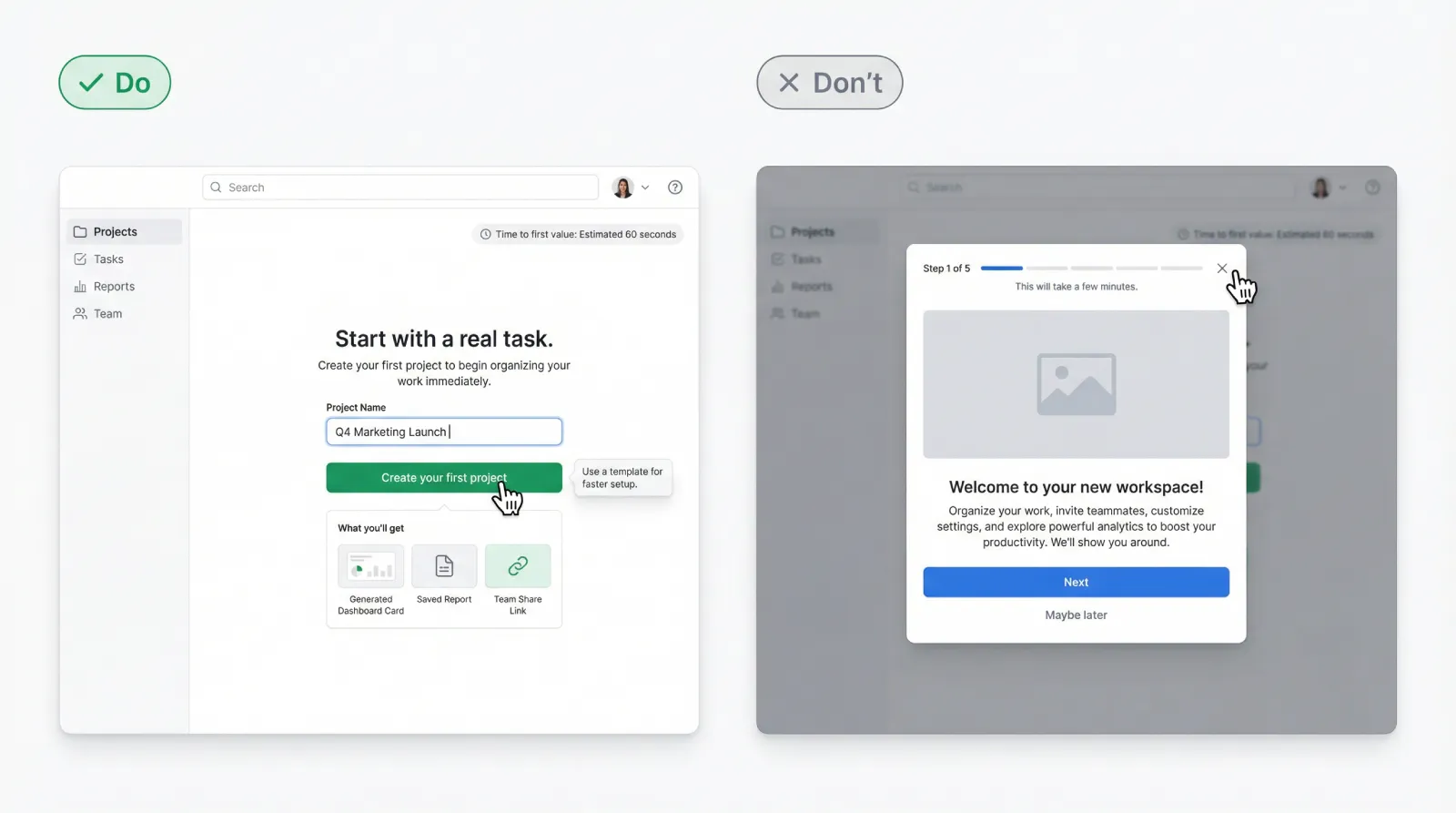 DON’T: A multi-step product tour that forces feature education before any real work.