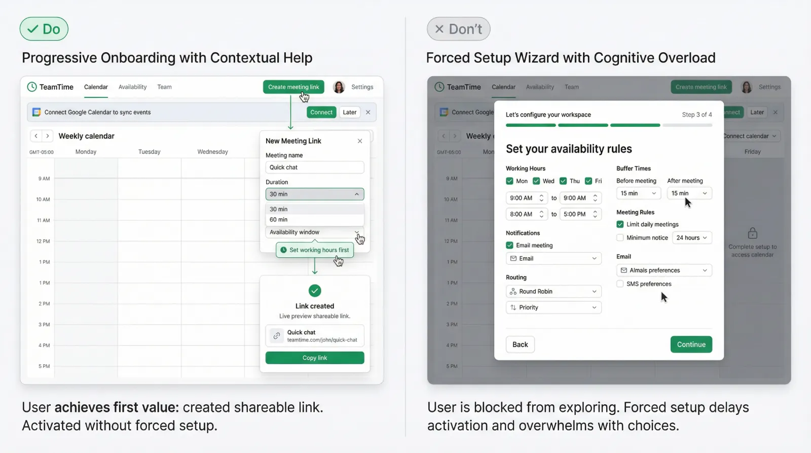 The core failure mode is subtle: you turn orientation into a mandatory sequence. That sequence steals three things the user relies on: