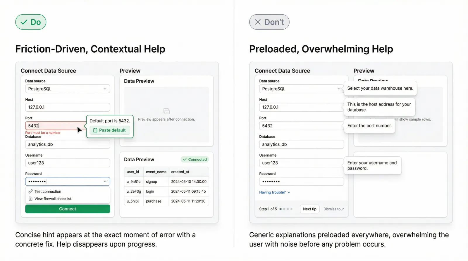 Every hint should point to the next action that advances the user’s job. If the hint explains concepts without enabling progress, it becomes noise.