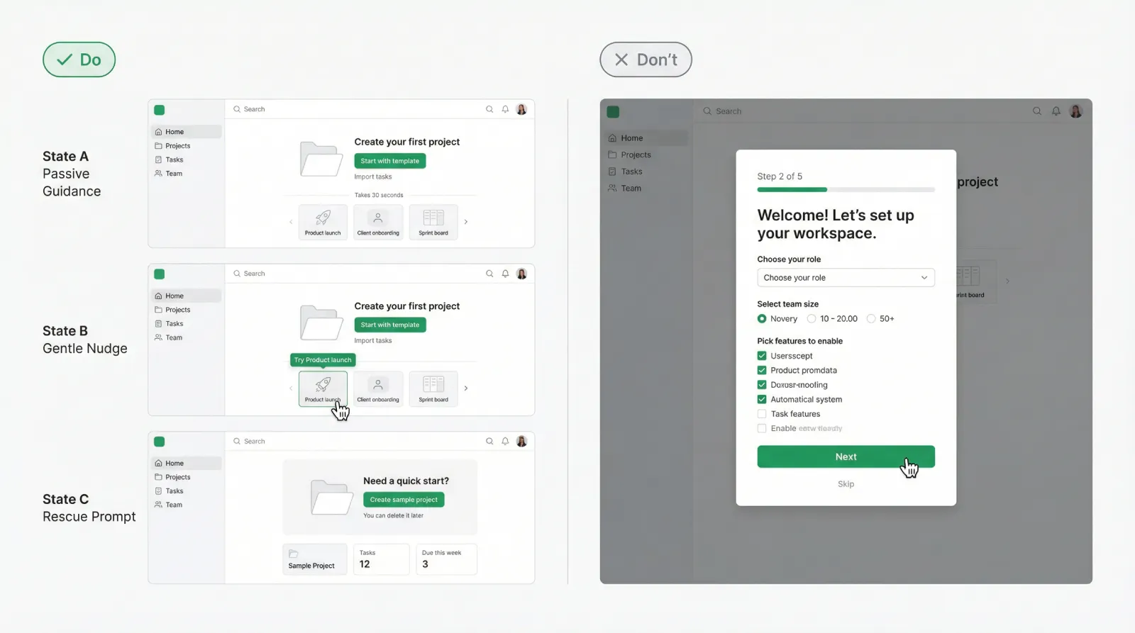 Examples: clear labels, smart defaults, sample data, strong empty states, inline helper text, short error messages that suggest a fix. In many products, improving passive help lifts activation more than adding a tour.