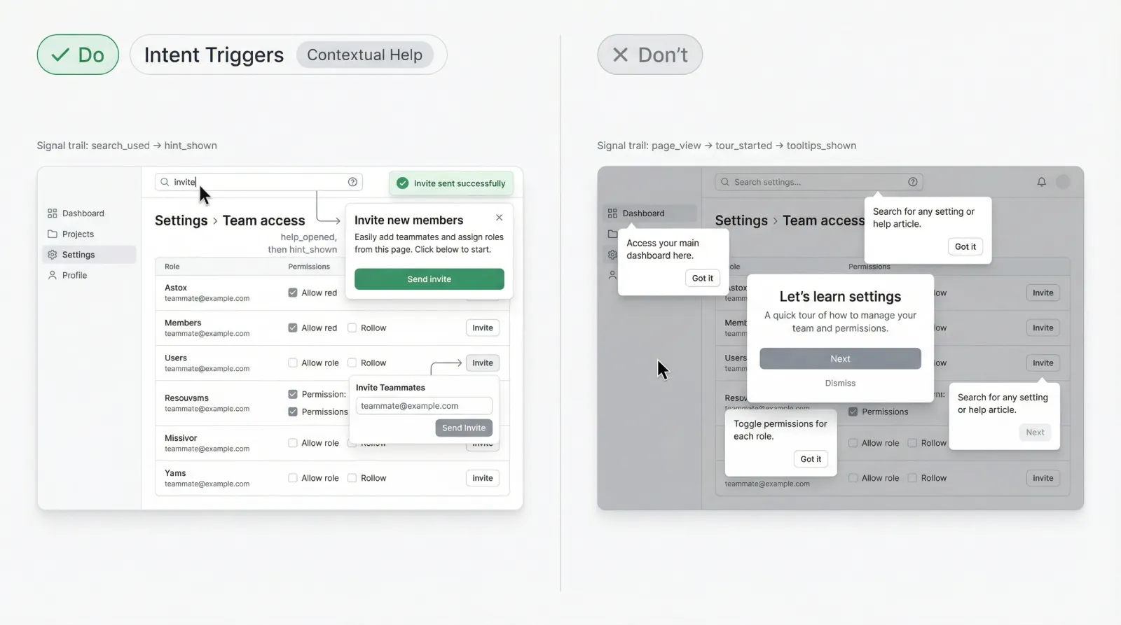 Your product has two “teachers.” The first is the default UI state (labels, empty states, examples). The second is contextual guidance (tooltips, nudges, rescue prompts). If the first teacher is weak, the second teacher becomes spam.