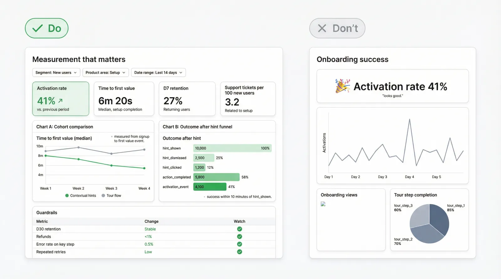 DO: A simple dashboard with activation, time to first value, retention, and hint outcomes.