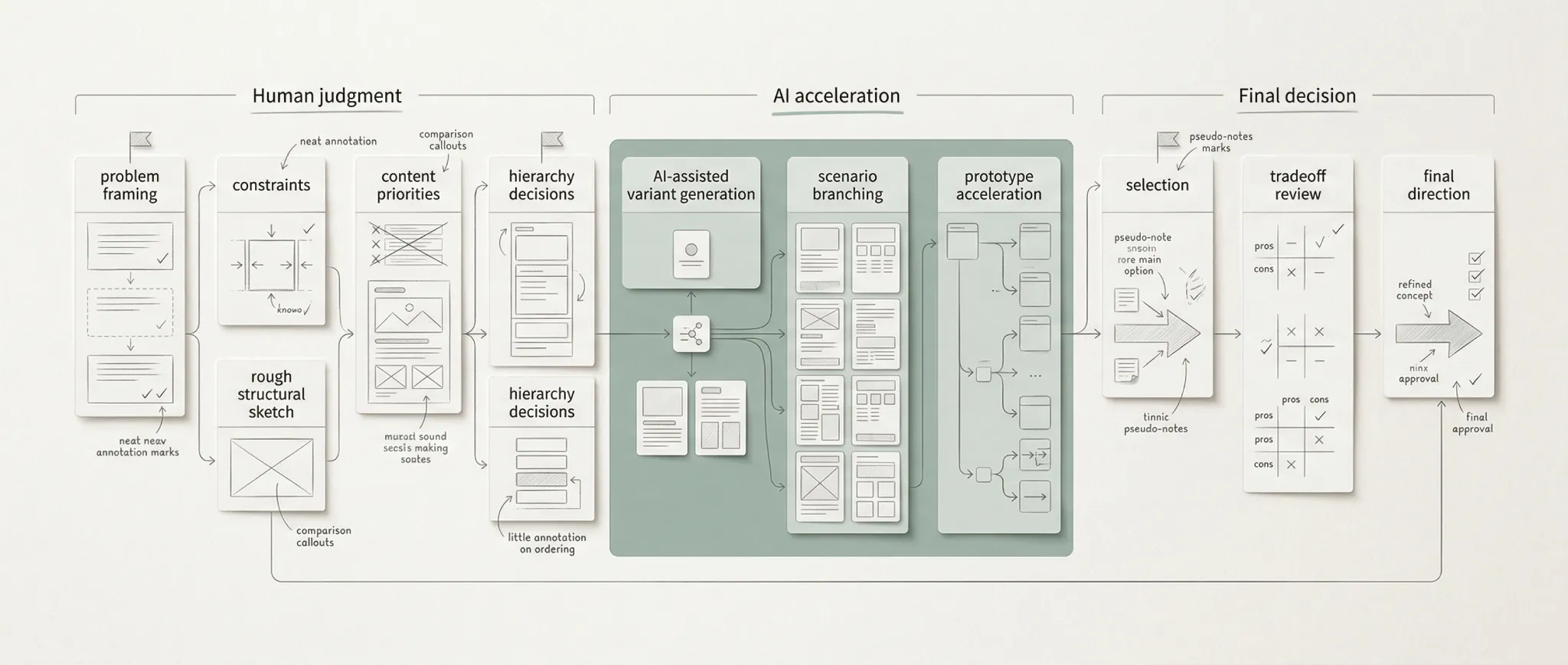 AI is most useful after the problem is framed and before the final choice is made: it helps expand directions, branch scenarios, and speed up prototypes, while judgment, tradeoff review, and final decisions stay human-led.