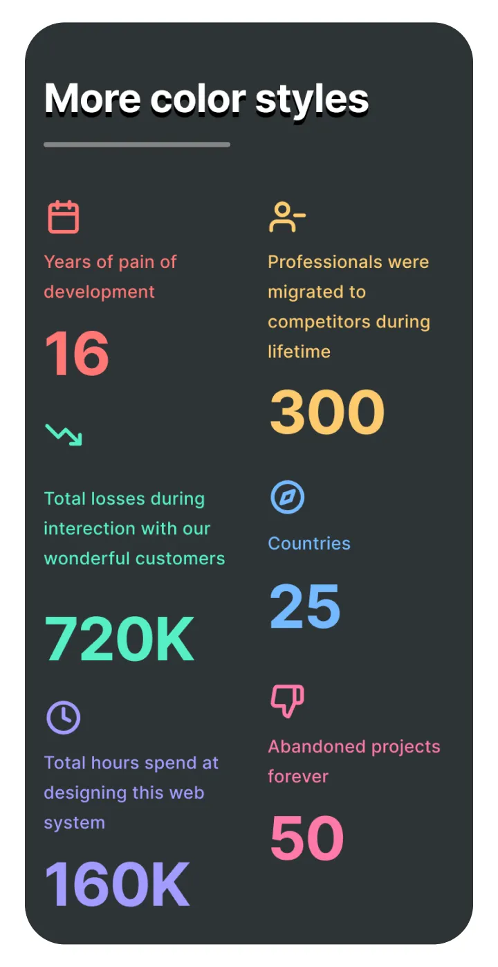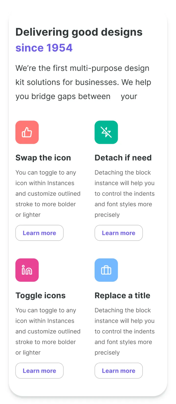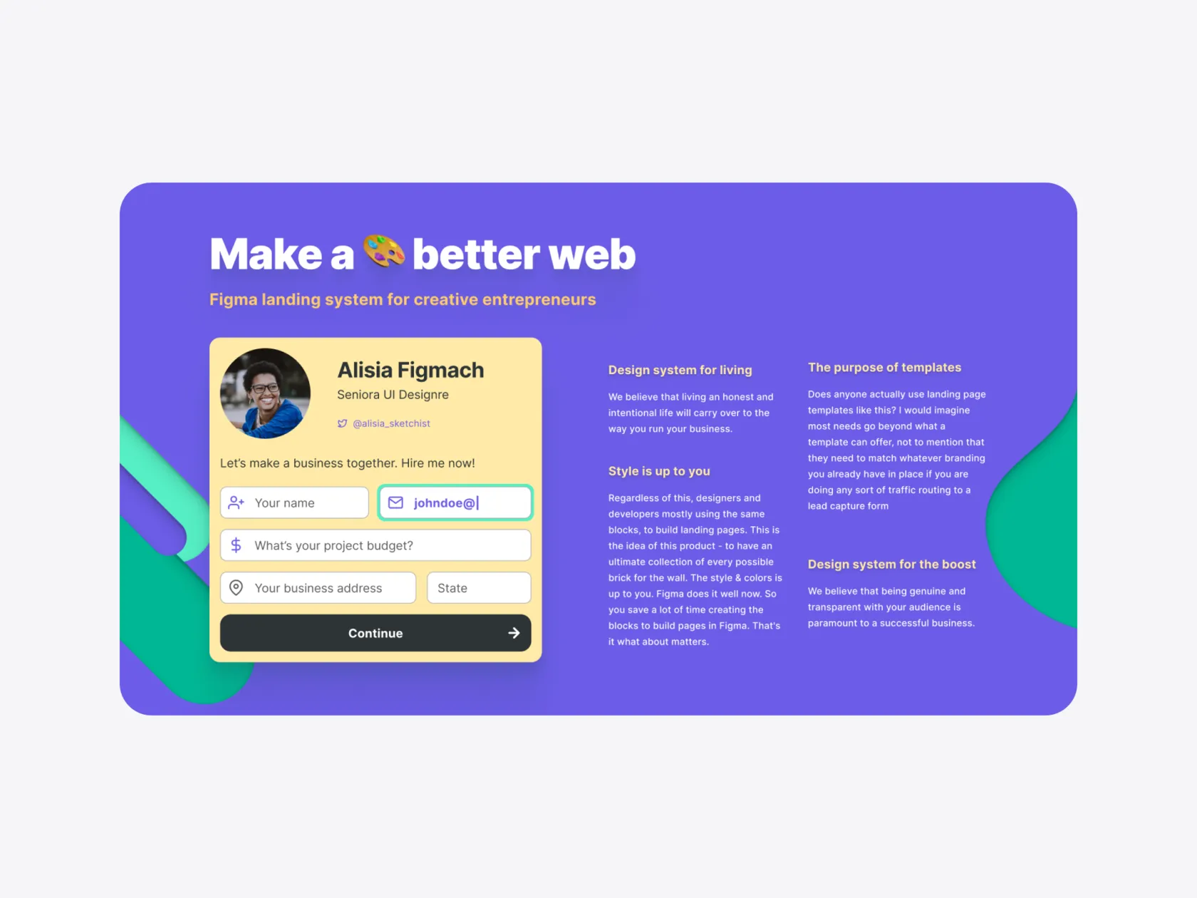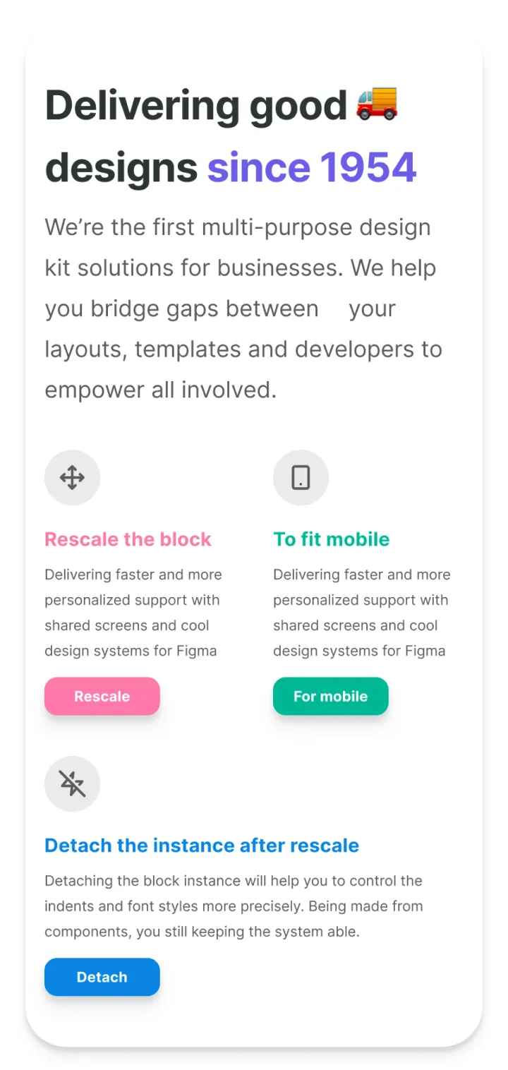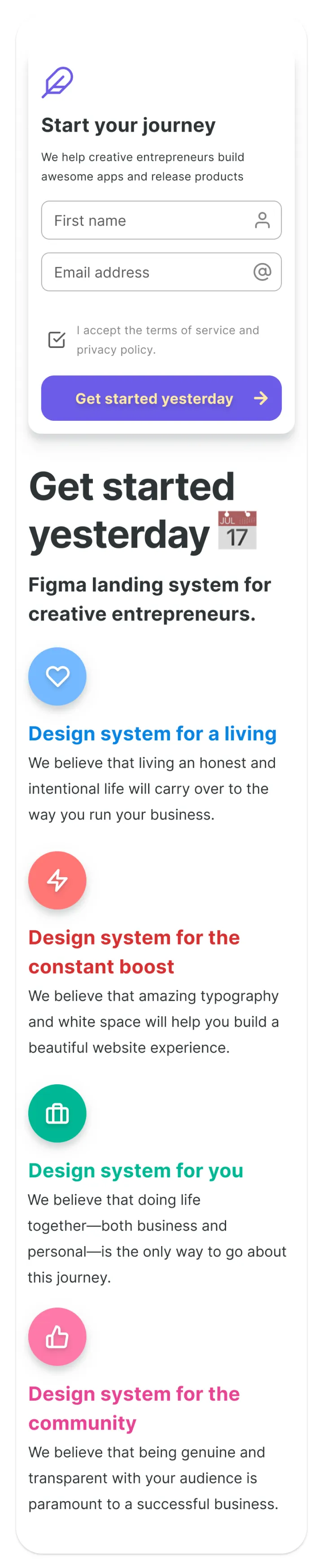 Figma web design system based on constrained & organized components used to produce effective landing pages.