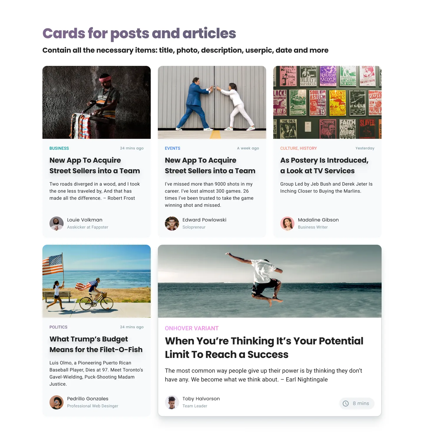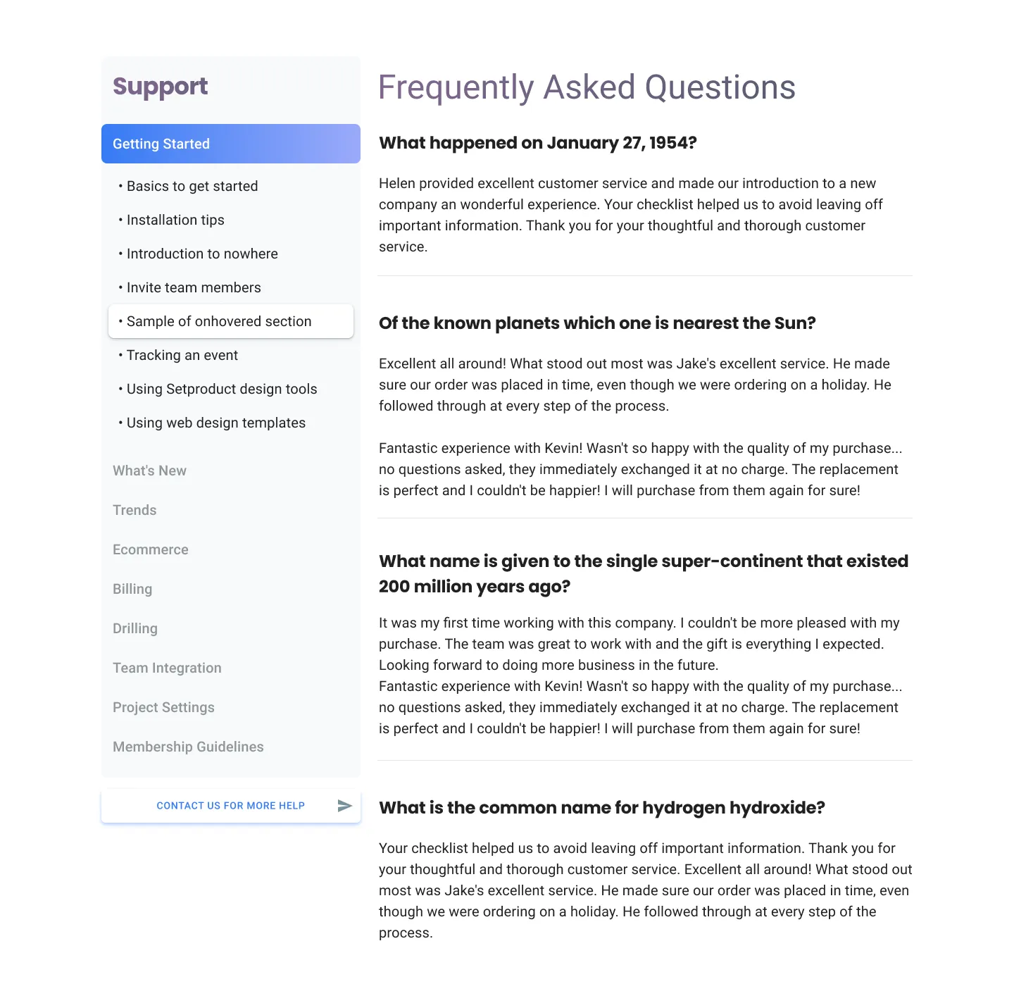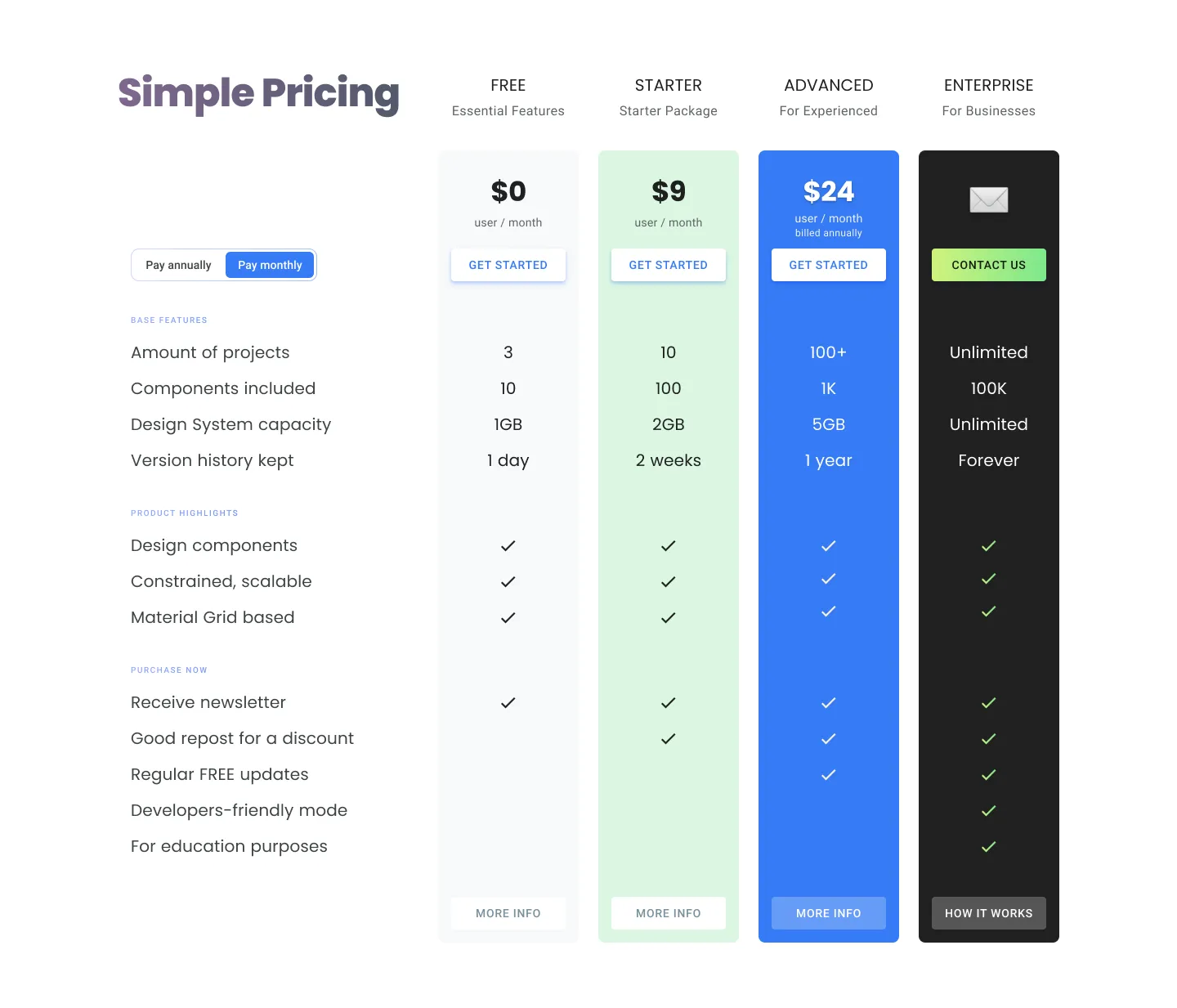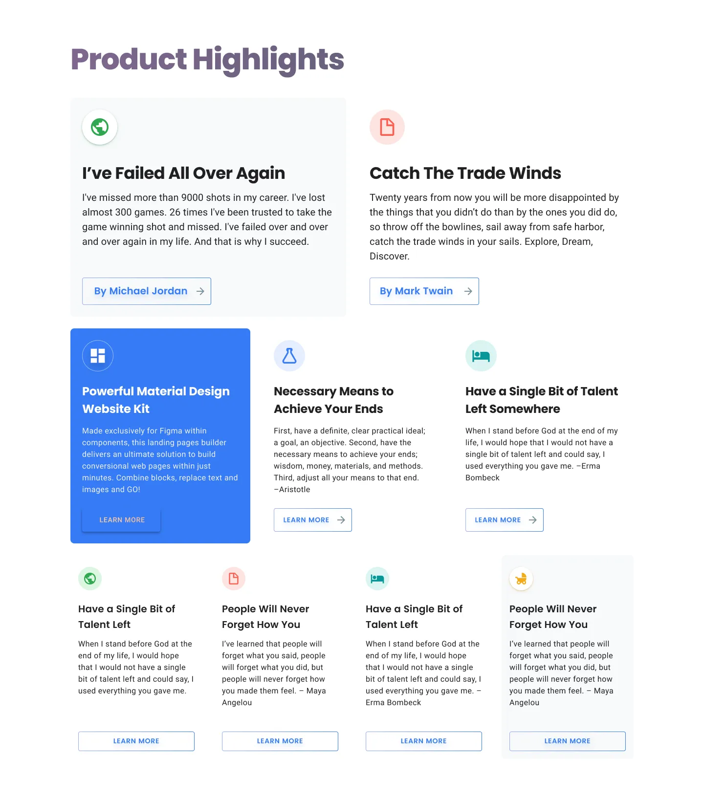 Hero covers, Navigation, Product features, Cards, Tables, Call to action, Pricing plans, Forms, Image grids, Testimonials, FAQ, Footers, Roadmap, Calculator, Code snippet and others.