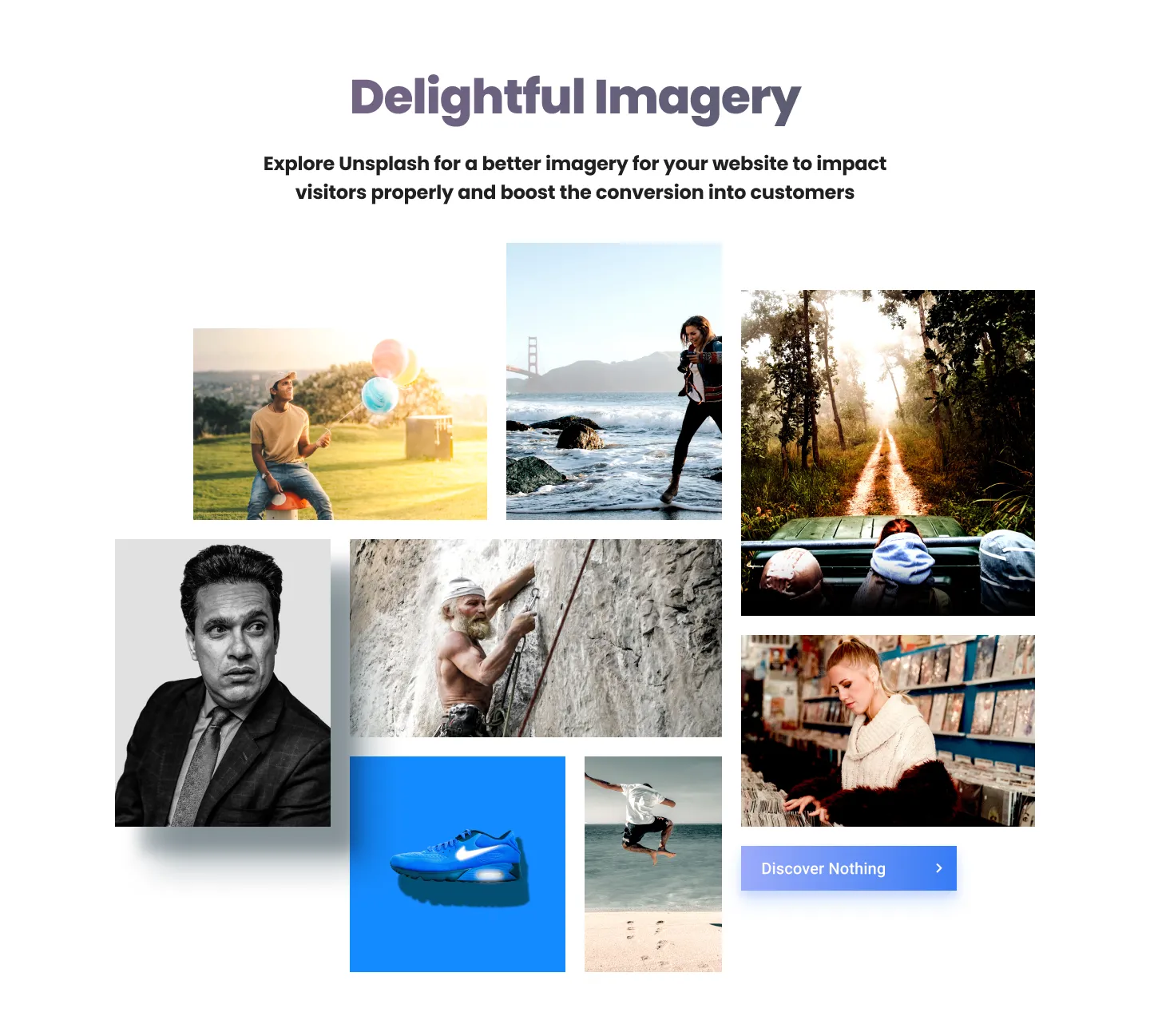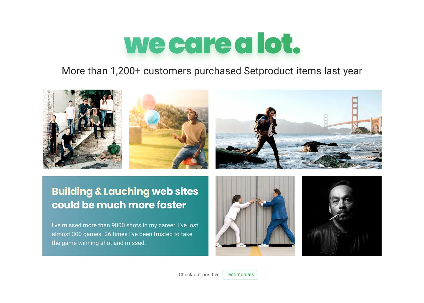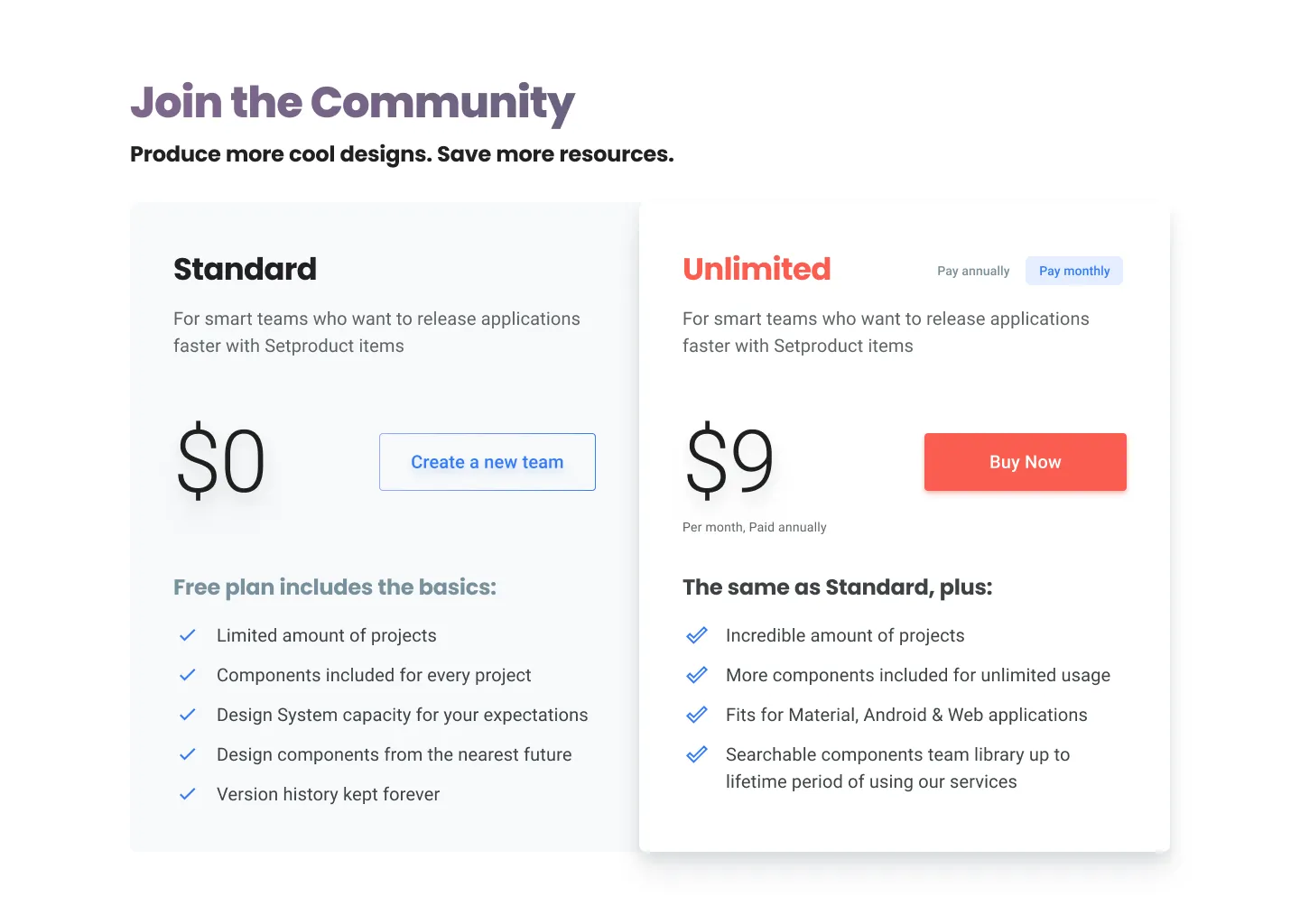 Hero covers, Navigation, Product features, Cards, Tables, Call to action, Pricing plans, Forms, Image grids, Testimonials, FAQ, Footers, Roadmap, Calculator, Code snippet and others.